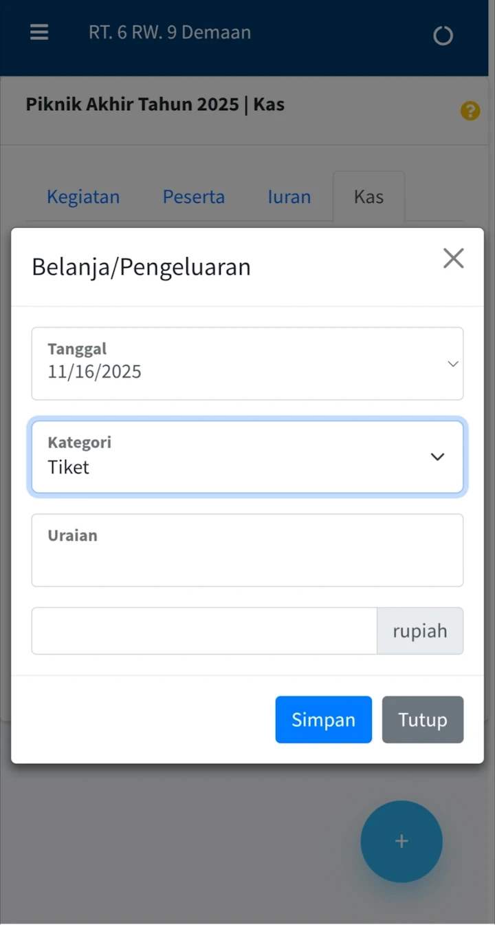 Memilih tanggal, lokasi, dan iuran per anggota untuk kegiatan yang akan diadakan.